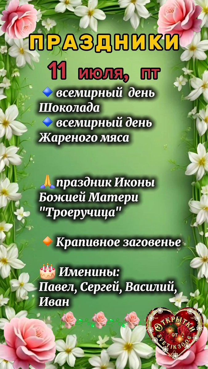 🔸️Приметы на 11 июля: 🌼Лес шумит без ветра — к дождю; 🌼Ссора в этот день — к долгому разладу; 🌼Не услышать крик кукушки в этот день — к ранней зиме; 🌼Вода в реках и колодцах прибывает — к ненастной погоде.