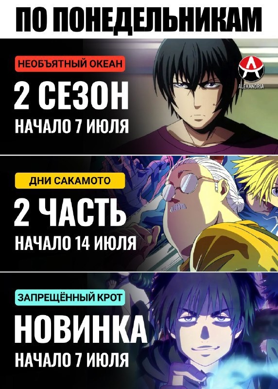 Анимешники, этим летом и осенью точно не заскучаем — нас ждёт мощнейший поток годноты чуть ли не каждый день недели, начиная с 1 июля! Расписываем по порядку: Понедельник: — 2 сезон «Необъятного океана» — «Дни Сакамото» (второй сезон с 14 июля) — Запрещённый крот — Увидимся завтра на фудкорте — Красавцы из клуба защитников Земли. Хаикара Вторник: — С нынешними детективами ничего не поделаешь — Губы замужней женщины на вкус как алкоголь — Космическое шоу ужасов Некрономико — 2 сезон «Сведённых кукушкой» — 4 сезон «Осомацу-сан» — Тёрки Среда: — 2 сезон «Я переродился торговым автоматом» — Клеватесс: Король демонических зверей — Перерождение: Цикл оммёдзи — Ремейк «Адского учителя... Подробнее: https://hard-tm.su/threads/100831/ 🕹HARD-TM — Подписаться