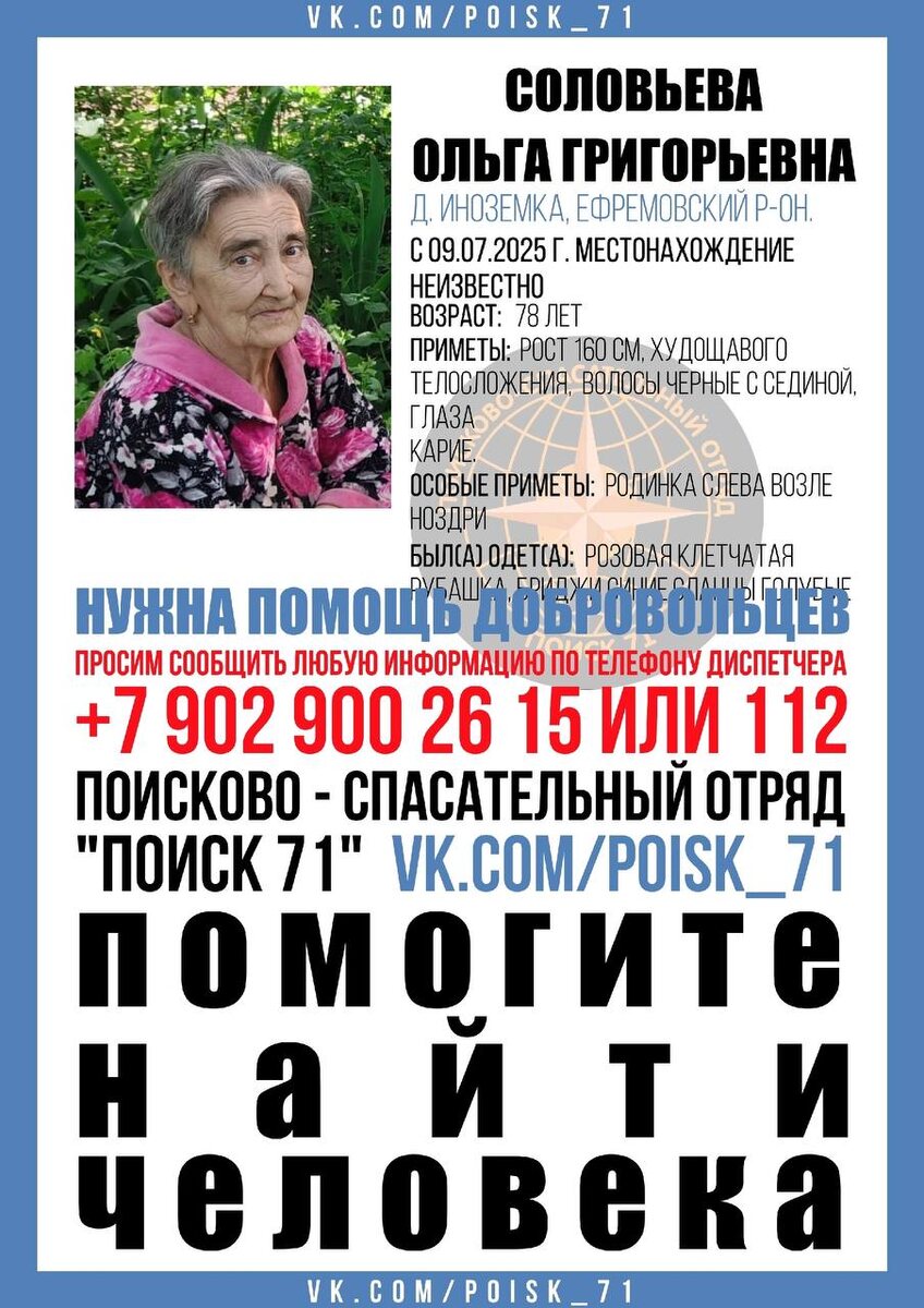 Пропала: СОЛОВЬЕВА ОЛЬГА ГРИГОРЬЕВНА,78 лет