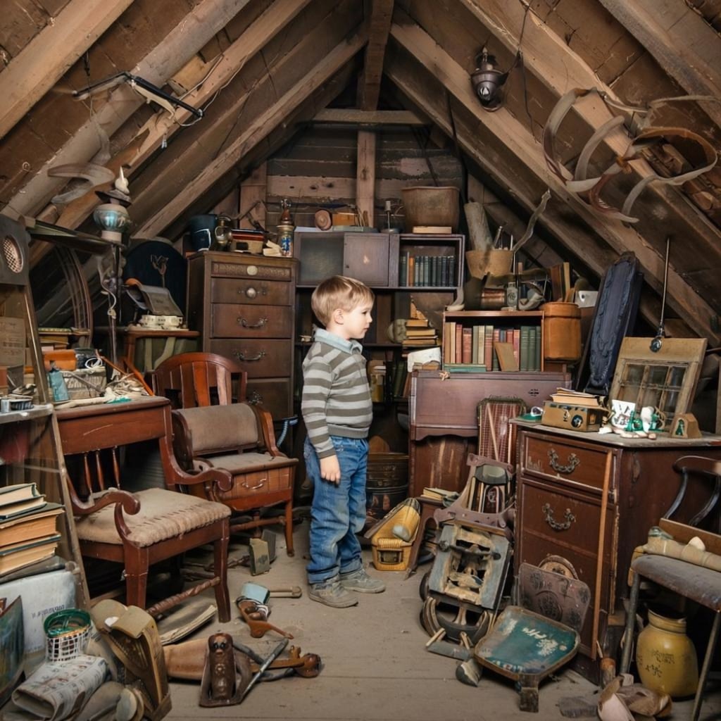 — Ну что, Тима, раз на улице дождь, может, заглянем в мой чулан на чердаке? Там есть такие штуки, которых ты еще никогда не видывал!