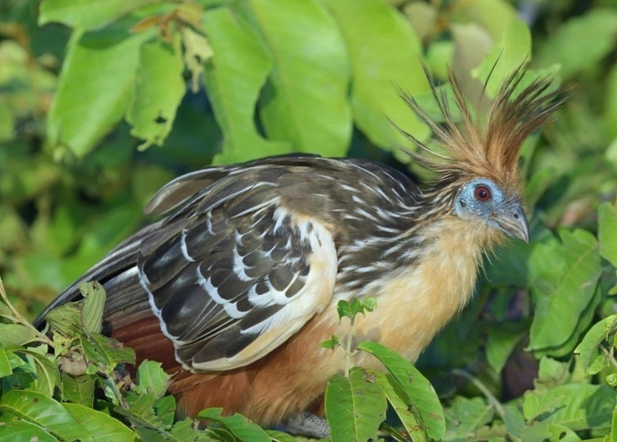 Это южноамериканский гоацин, друзья. И гоацин – птичка странная. Вот так вроде посмотришь: ну ничего особенного в этом гоацине нет. Яркий, нарядный, на фазана немного похож, но не тут-то было. Гоацин – убеждённый вегетарианец, а поскольку птица он крупная – до 70 см в длину, а листья – пища не слишком сытная, то жрёт он постоянно. Населяют гоацины кроны растущих над водой деревьев. Неспешно перебираясь с ветки на ветку, гоацин весь день уминает жёсткую трудноперевариваемую листву. Чтобы усвоить из такого обеда всё, что можно, гоацин эволюционировал поистине неожиданно. Длинный кишечник для слабаков. У гоацина вырос гигантский зоб, где происходит сбраживание и ферментация пищи. Занимающий большую часть грудной клетки, он настолько велик, что сидящий гоацин для удержания равновесия обычно опирается грудью на ближайшую ветку, для чего там даже есть специальное кожное утолщение, вроде мозоли. Ну а потом пища, уже почти переваренная, двигает в остальные отделы ЖКТ. Ну окей, пищу переварили,