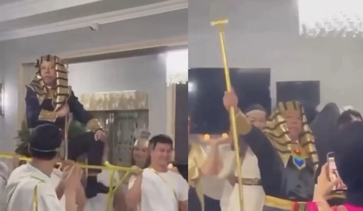 Посреди зала он остановился и театрально поднял жезл, словно благословляя всех присутствующих. Праздник снимали гости, и видео уже разлетелось по Instagram.
