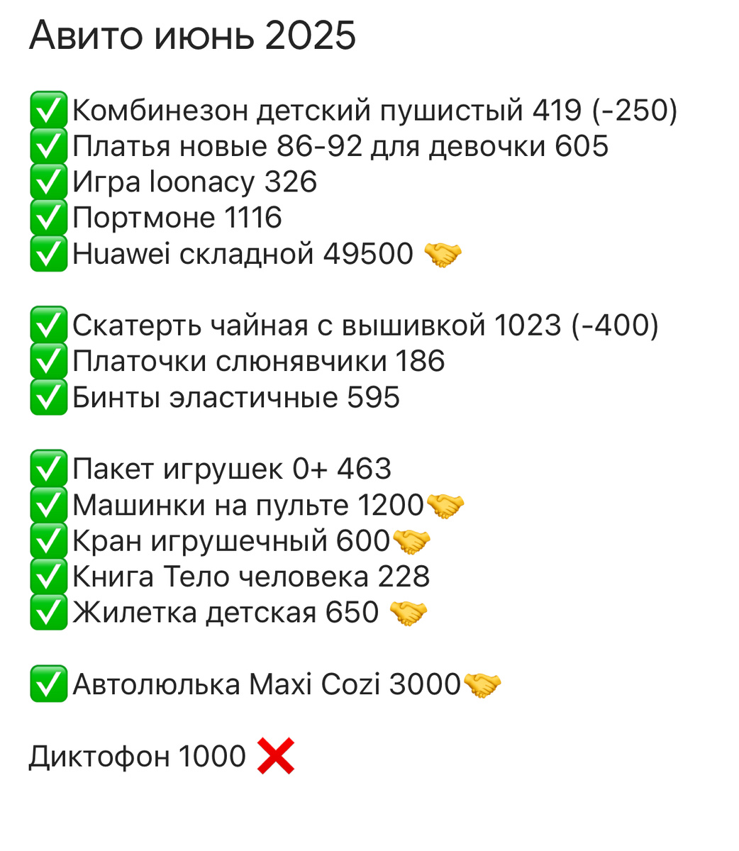 Месяц совсем не похож на отпускной и вялотекущий — пока были силы выкладывать, продаж тоже немало. Но вторая часть месяца подкачала — а с одной продажей я вообще осталась без товара и без денег. Сейчас расскажу. О первой части продаж писала здесь Расскажу о второй половине июня Такого добра у меня много, потихоньку начала выставлять. Пакет-секреты, чтобы уходило, а не висело: Можно, наверное, если напрячься, выкружить на пару сотен рублей больше, но у меня нет ресурса. Пусть будет так. Тоже не большого продаванского искусства кейс, но зато легко и быстро. Собрала самые большие машины, которые лежали сто лет и угнетали меня тем, что их надо заряжать-проверять-проводить ТО и вытирать от пыли перед продажей. Лежали без движения с момента переезда, занимая целую полку. Собрала и выставила их в чат соседей по экстремально низкой цене — 1200₽ за все. Но с условием «приходите и проверяйте сами». Забрали в тот же вечер. И следом состоялась допродажа — я положила не тот проводок зарядки, а