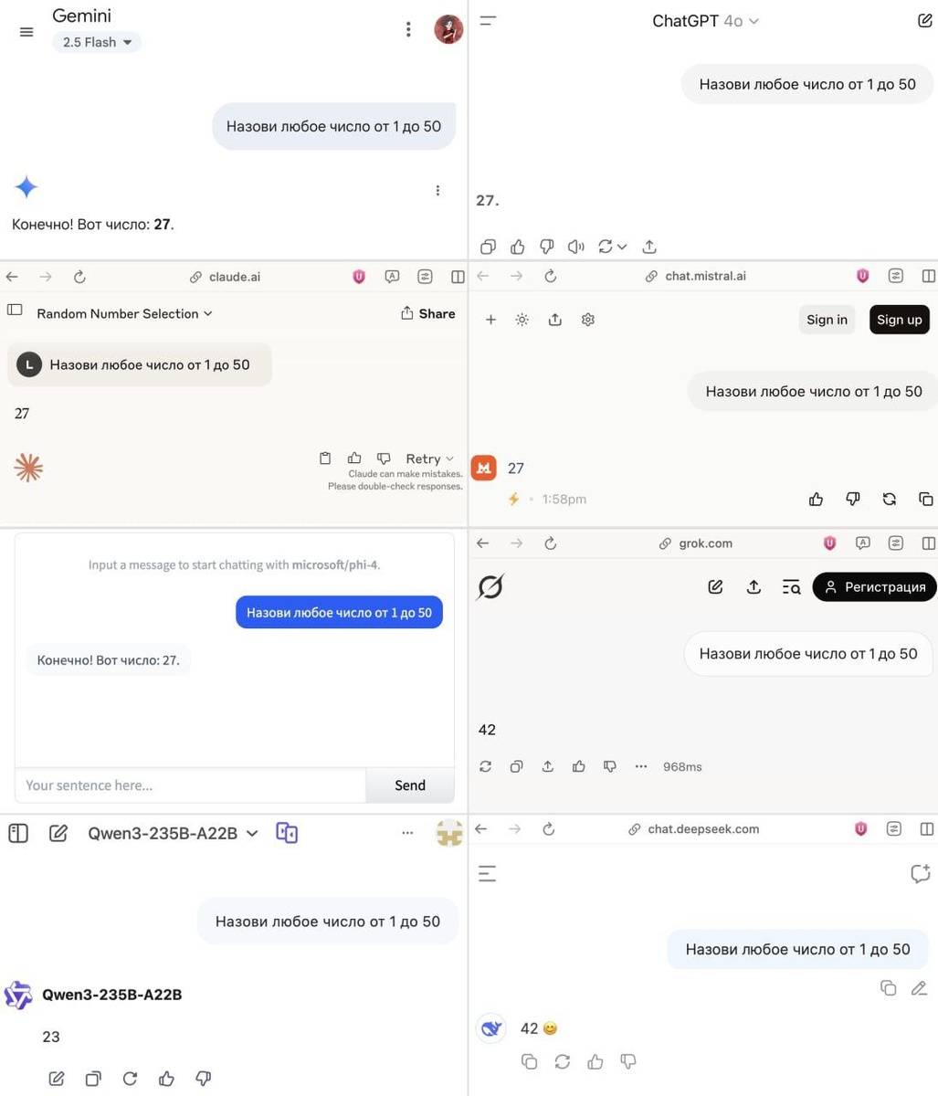 Прикол: если попросить чат-ботов назвать случайное число от 1 до 50, большинство из них (7 из 8) напишут 27.