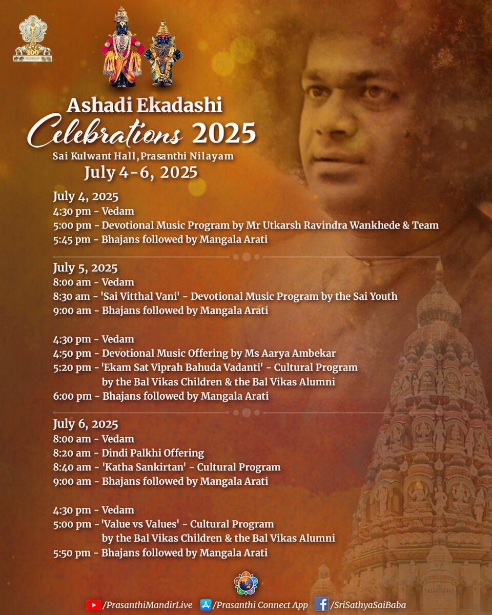 Празднование Ашади Экадаши 2025 г. Саи Кульвант Холл, Прашанти Нилаям 4-6 июля 2025 г. 4 июля 16.30* - Веды 17.00 - Программа духовной музыки в исполнении м-ра Уткараш Равиндра Ванкхеде и группы 17.45 - Бхаджаны и Мангала Арати 5 июля 8.00 - Веды 8.30 - "Саи Виттал Вани" - программа духовной музыки в исполнении Саи молодёжи 9.00 - Бхаджаны и Мангала Арати 🪷🪷🪷 16.30 - Веды 16.50 - Программа духовной музыки в исполнении мисс Аарья Амбекар 17.20 - Культурная программа "Экам Сат Випрах Бахуда Ваданти" в исполнении детей и выпускников Бал Викас 18.00 - Бхаджаны и Мангала Арати 6 июля 8.00 - Веды 8.20 - Подношение "Динди Палкхи" 8.40 - Культурная программа "Катха Санкиртан" 9.00 - Бхаджаны и Мангала Арати 🪷🪷🪷 16.30 - Веды 17.00 - Культурная программа "Ценность или ценности" в исполнении детей и выпускников Бал Викас 17.50 - Бхаджаны и Мангала Арати * время по Индии, время по Москве - минус 2,5 часа от указанного. Смотрите прямую трансляцию по ссылке: https://youtube.com/