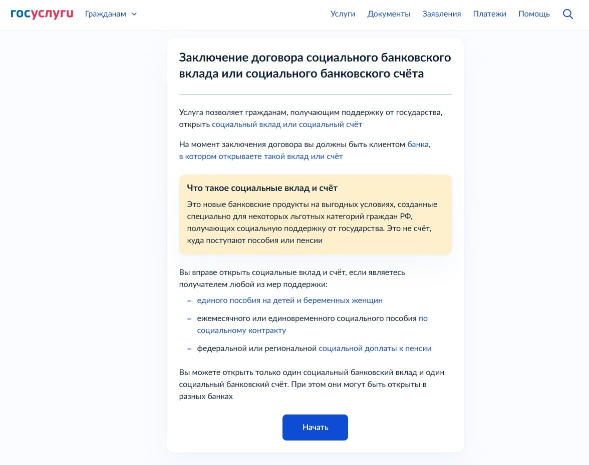 Минцифры сообщает, что на портале Госуслуг стал доступен сервис по оформлению новых банковских продуктов: социальных вкладов и счетов. Он предназначен для льготных категорий граждан, которые получают социальные выплаты и являются клиентами банков-участников программы. Оформить социальный счет или вклад могут граждане РФ старше 18 лет, которые получают хотя бы одну из следующих мер соцподдержки: · единое пособие на детей и беременных женщин · ежемесячное или единовременное пособие по соцконтракту · федеральную или региональную социальную доплату к пенсии Условия социального вклада следующие: · размер вклада – до 50 тыс. руб. (пополнять его можно в любое время, но в пределах лимита) · срок вклада – 1 год (с возможностью продления) · процентная ставка – максимальная из тех, которые предлагает конкретный банк по вкладам сроком от 1 месяца до 1 года (проценты начисляются и выплачиваются ежемесячно) Условия социального счета следующие: · ограничений по сумме нет (пополнять и снимать можно в