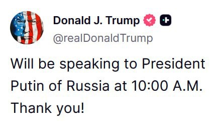 В ответ на пост ❗️ Trump confirms surprise talk with Putin is in 15 minutes