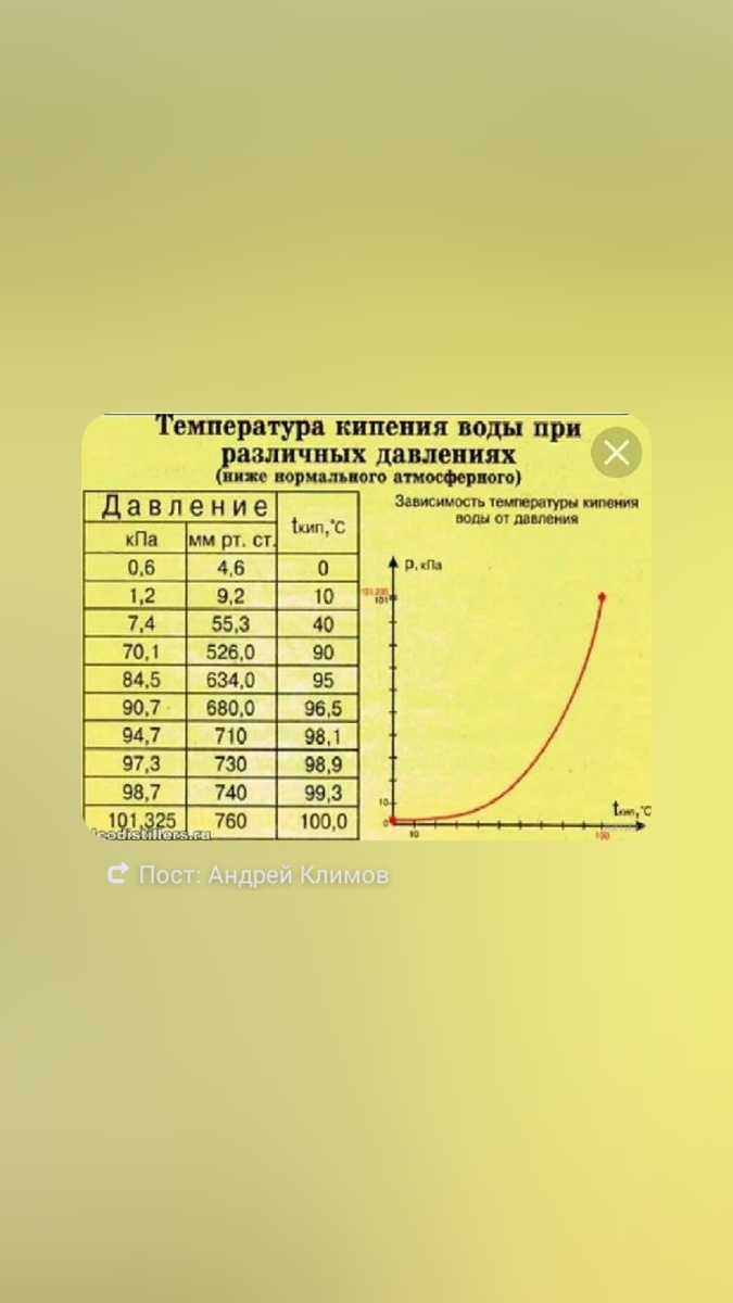 Опреснитель воды за счёт энергии уличного тепла и/или солнечного света и сухого воздуха Источником теплой воды, которую нужно очистить, может быть теплоизолированный снизу и с боков водоем, прикрытый сверху двумя-тремя прозрачными пленками или рамами с 2-3 стеклами. Днём грязная вода будет прогреваться Солнцем через пленки или рамы со стеклом до дна. Чтобы свет не отражался наружу стенки и дно водоема должны быть черными. Тогда вся энергия света пойдет на нагрев воды и испарившаяся вода не унесет тепло дальше пленок или стекла. Заметим, что при снижении давления воздуха над водой её температура кипения снижается как приведено в таблице. Я предлагаю снизить давление воздуха над водой в десятки и сотни раз, подняв насосами грязную воду в две трубы для грязной воды и ранее дистиллированную воду в третью трубу на высоту до 10 метров и убрав остатки воздуха в пространстве между трубами выше уровня воды в трëх трубах. После заполнения труб нужно перекрыть вверху кран, через который выпуска