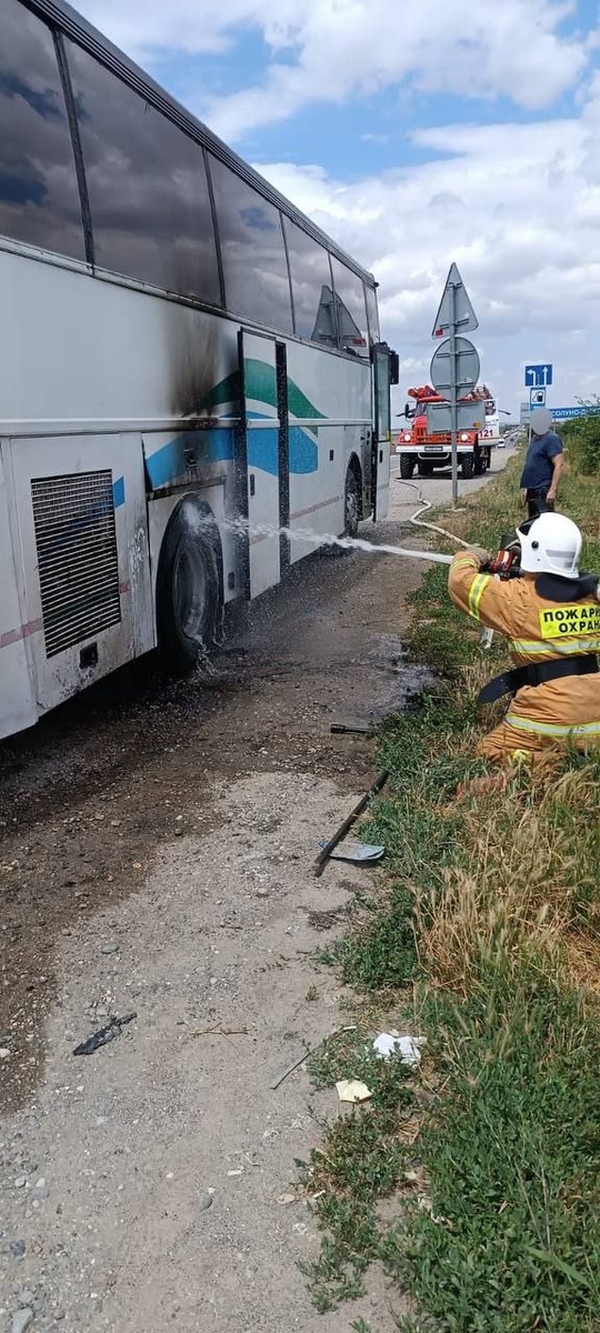 Сегодня на трассе «Кавказ» у автобуса загорелось колесо. В экстренную службу о происшествии сообщил очевидец. Водитель не растерялся и использовал огнетушитель.