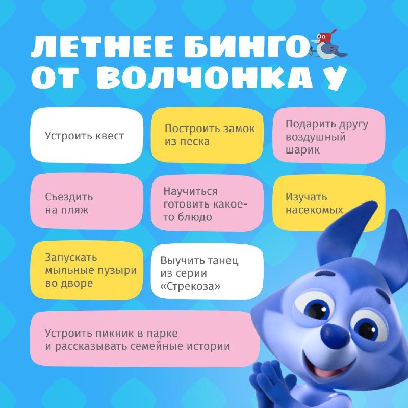 Летнее бинго приключений от Волчонка У — готовы принять вызов?😎 Первый месяц лета уже пролетел. А вы успели сделать с ребенком всё, что планировали на июнь? Чтобы провести оставшиеся два месяца с максимальной пользой и радостью, мы подготовили для вас список летних дел, которые точно стоит попробовать☀️ А в нашем сборнике — инструкции для воплощения каждого пункта. ✅Отмечайте, что уже выполнено, и не забудьте поделиться своими успехами в комментариях. Смотреть в ВК Смотреть на YouTube Смотреть на RuTube
