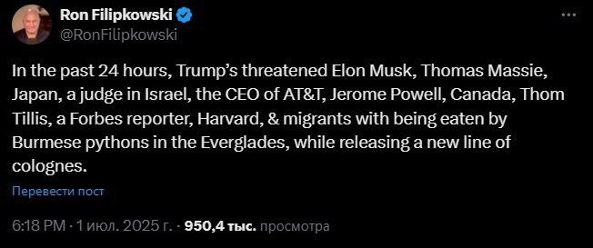 За последние 24 часа Трамп угрожал Илону Маску, Томасу Мэсси, Японии, израильскому судье, генеральному директору AT&T, Джерому Пауэллу