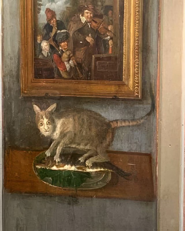 Этот пушистый бандит, отчаянно хватающий рыбу всеми четырьмя лапами, был запечатлен на деревянном панно в доме некоего Матье Мига в Мюлузе, Франция. Видимо, художник пытался поймать кота с поличным, но усатый преступник сбежал раньше, чем его успели как следует "задержать" кистью. Теперь этот шедевр кошачьего беспредела украшает исторический музей Мюлуза, напоминая нам: воры были всегда, но не все попадались. Особенно если у них есть пушистая морда и молниеносные лапы. 🐾🐾 Всем рыбов! Кот Пикассо 🐈⬛ Искусство