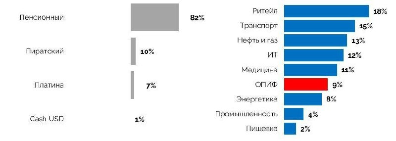 💼 Разбивка активов в портфеле Делимся инфографикой о том, как распределены активы в портфеле руководителя аналитики GIF. Сначала посмотрите на картинку, а затем — аналитическую часть. 📊 Для начала расшифруем, что обозначают элементы в левом столбце: Пенсионная часть — активы для долгосрочных целей (Например, покупка недвижимости, медстраховка, образование ребёнку); Пиратская — рискованные идеи, по сути венчурный сегмент; Платина — доля под возможную переоценку металла, которая скоро будет выведена из портфеля. Теперь пройдёмся по внутренней структуре: — 82% капитала сосредоточено в пенсионной части — это надёжно и стабильно. Такой вес защищает портфель от резких просадок и обеспечивает умеренный рост. Если цель — сохранить и приумножить капитал без лишних рисков, ставка на пенсионные активы оправдана. — Для большего потенциала роста есть — рискованные бумаги (пиратская часть) и платина. Пиратская часть ограничена 10%, так что даже при просадке она не утащит за собой весь портфе