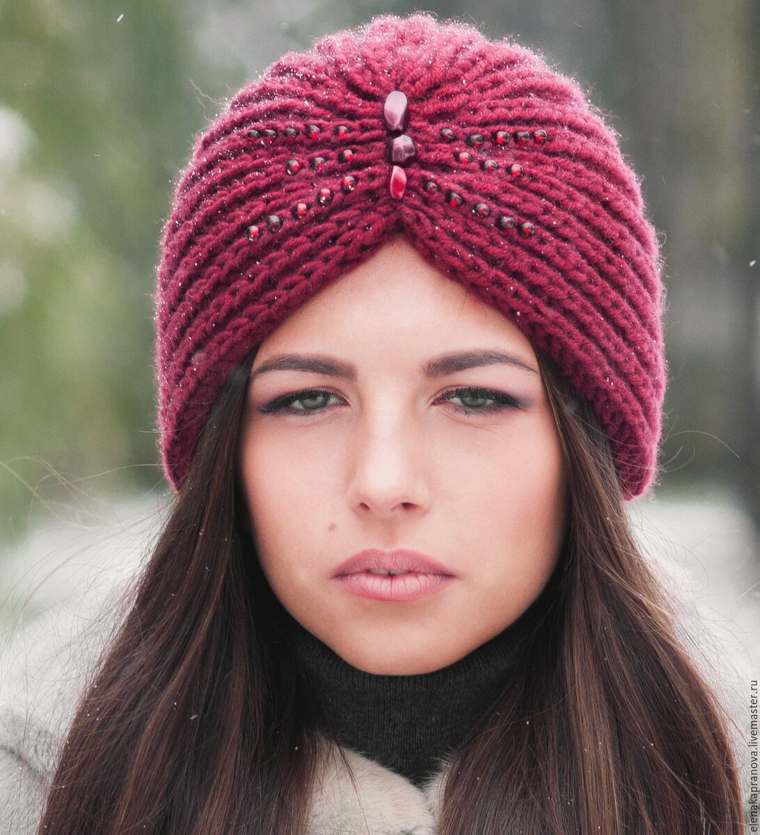 Шапка должна быть свободной, связанной из объемной пряжи. В этом случае она придаст восточный колорит выбранному образу, и не будет обтягивать голову.