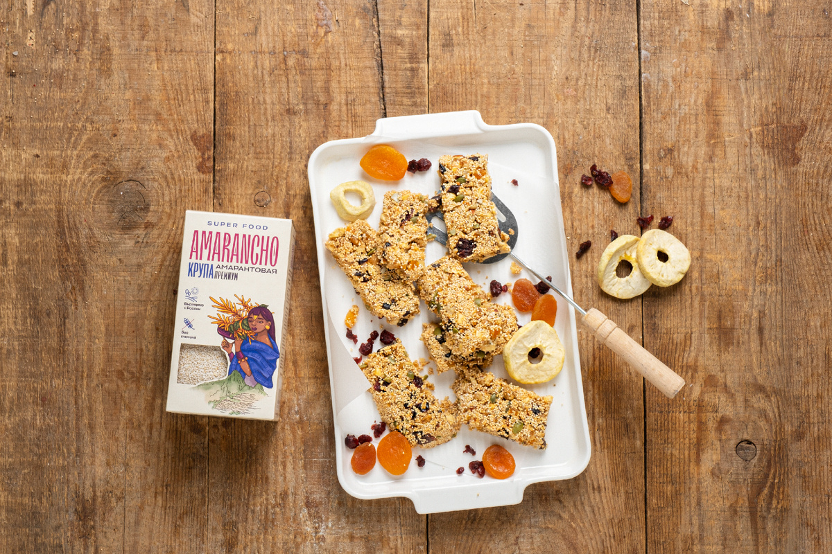 10–12 штук 20 мин + 2 ч 260 г крупы амаранта Amarancho 100 г сухофруктов (сушёная клюква, курага, финики, чернослив) 60 г грецких орехов 60 г мёда 120 г арахисовой пасты 40 г тыквенных семечек 20 г сушёных яблок 1 ч. л. ванильного экстракта 1. Грецкие орехи и тыквенные семечки порубите ножом. Смешайте амарантовую крупу, орехи, тыквенные семечки и семена чиа. 2. Курагу и чернослив нарежьте небольшими кусочками, сушёные яблоки поломайте. Финики пробейте в блендере до пастообразного состояния. Добавьте сухофрукты к амарантовой смеси. 3. Арахисовую пасту растопите в микроволновке, 20–30 сек. Добавьте финиковый сироп, ванильный экстракт и перемешайте. Залейте полученной смесью амарант и хорошо перемешайте, пока тесто не сформируется в плотную массу. 4. Прямоугольную форму для выпечки полностью застелите пергаментной бумагой и выложите смесь для батончиков ровным слоем, плотно утрамбовывая. Уберите в холодильник на сутки, затем разрежьте на порционные батончики.