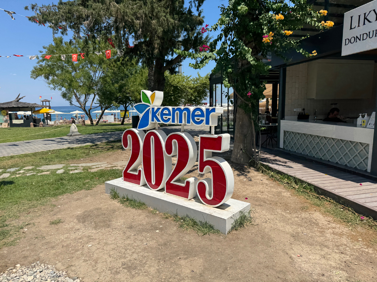 Увидите арт-объект Kemer 2025, разноцветные арочки в виде сердечек, а там и пляж - бесплатный городской.