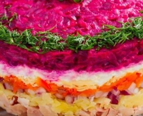 Ингредиенты и способ подачи напоминает хорошо известный салат " Селёдка под шубой". Но вместо селёдки используем копчёную курицу и лук добавляем маринованный. Ингредиенты: Отварить овощи и яйца, остудить. Приготовить маринованный лук: Порезать 1 луковицу, добавить по 0,5 ч.л сахара и соли, 1 ст.л. яблочного уксуса, 1 ч.л. соуса "Терияки" и 100 мл воды. Оставить мариноваться на минут 15. Салат можно выкладывать слоями в салатник либо использовать сервировочное кольцо (каждый слой, кроме курицы, нужно немного посолить) . Овощи и яйца натереть на крупной тёрке, мясо курицы порезать кубиком. Первым слоем выложить картофель (смазать майонезом); вторым слоем - маринованный лук (очень рекомендую маринованный, свежий совсем другой вкус даёт); третьим слоем- копчёное куриное мясо и опять смазать майонезом. четвертым слоем - яйца; пятым слоем - морковь (можно и сладкий перец добавить для хруста и свежести 🌶 и опять смазать майонезом; шестым слоем - свёкла и майонез. Сверху посыпать гре