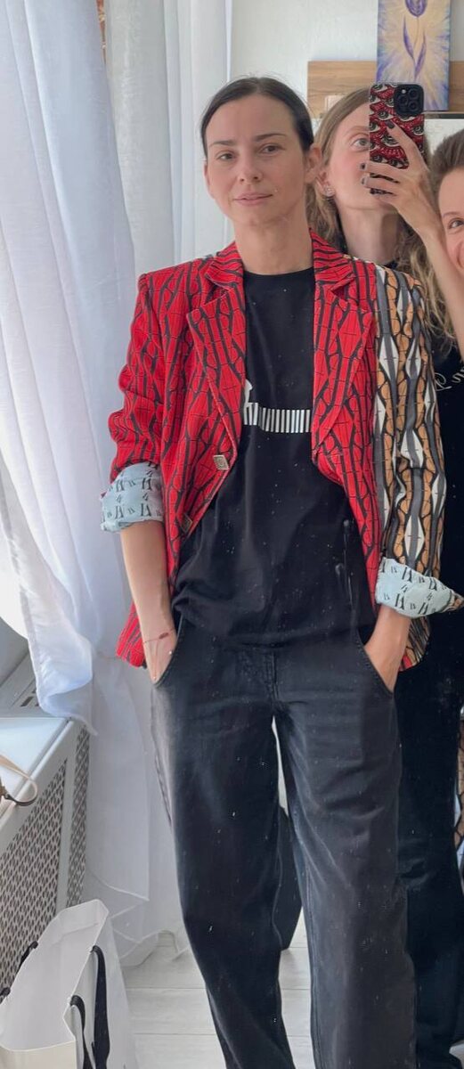 Кстати, исключительно, я считаю, на актрисе Тате Яхиной смотрится этот жакет. С черной футболкой и джинсами не классического кроя, жакет на размер больше, чем она носит обычно, смотрится расслабленно и оч стильно