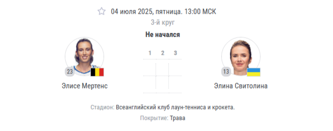 Итог: Свитолина — фаворит благодаря опыту, психологическому преимуществу в очных встречах и адаптации к поздним стадиям Уимблдона. Мертенс способна взять сет за счёт свежести турнирной формы (титул в Хертогенбосе), но её нестабильность в первых сетах и слабость в решающих геймах станут ключевыми минусами. Ожидается победа украинки в двух сетах (7:5, 6:4) с тоталом геймов 22+.