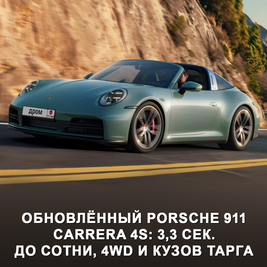Кстати, последняя в этом году празднует 60-летний юбилей 😎 Семейство 911 проходит рестайлинг постепенно. До этого были представлены модернизированные заднеприводные версии, теперь очередь дошла и до полного привода. Причём в версии «тарга» доступна только такая машина. Техника и характеристики: — Битурбомотор 3,0 л на 480 л.с. (530 Нм). — 8-ступенчатый робот и 4WD с многодисковой муфтой подключения передних колёс. — 3,3 сек. до сотни, максималка — 308 км/ч. — Тормоза от GTS, полноуправляемое шасси, спортивный выхлоп. — Тарга оснащена механизмом, который прячет крышу за 19 сек. — Второй ряд — бесплатная опция для кабриолета и тарги. — Среди оснащения — натуральная кожа, LED-оптика, беспроводная атмосферная подсветка, колёсные диски 20” спереди и 21” сзади. — Цена в Германии — от €163 000. 911 как всегда хорош или пора бы Porsche уже пересмотреть этот дизайн? 🤔 #дромновость #porsche #porsche911 #германия #рестайлинг