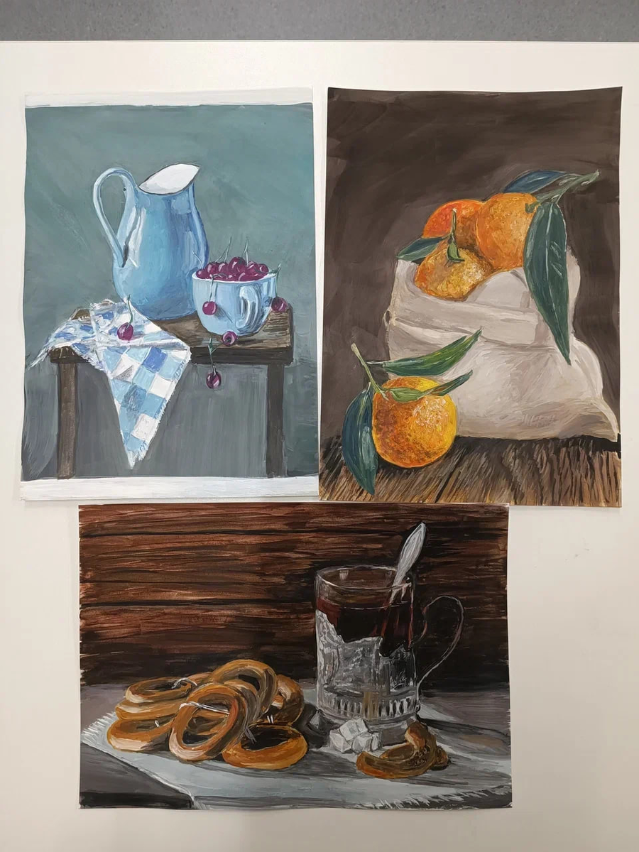 Анастасия ставит свой первый натюрморт. Делает тоновый и цветовой разбор. И — внимание — расписывает дверь на даче. Не по наитию, а с набросками, планом, осмысленно.🎨