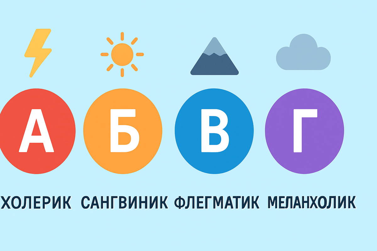 Растровое изображение 800x400px. Светло-голубой фон с четырьмя цветными кругами в ряд. Красный круг с буквой "А" (Холерик), оранжевый с "Б" (Сангвиник), синий с "В" (Флегматик), фиолетовый с "Г" (Меланхолик). Над каждым кругом — иконка: молния, солнце, гора, облако. Современный плоский дизайн.