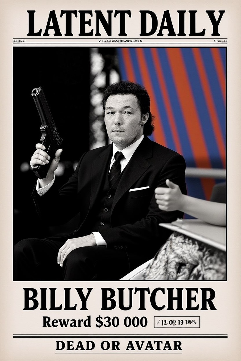 zoom out to make the frame a part of the newspaper, add a title below the frame in the style of 1920's newspaper "Billy Butcher" and subtitle below it "Reward $30 000" and below it "Dead or avatar" and a headline "Latent Daily" above the frame, change a white hoodie to be a black suite and tie, replace microphone with a minigun, maintain the facial characteristics and scale, black and white photo 1920's style