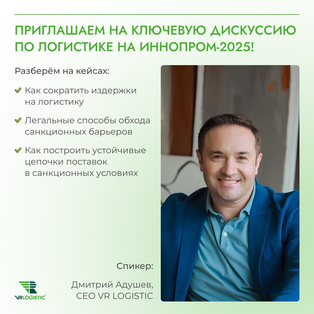 👍 Ключевая дискуссия на ИННОПРОМ: как бизнесу выживать в условиях разрыва поставок? Калининград - не единственный регион, столкнувшийся с логистическими вызовами. Уже 9 июля VR LOGISTIC представит решения для промышленных компаний! 🗣Спикер: Дмитрий Адушев, CEO VR LOGISTIC, эксперт с более чем 10-летним опытом в международной логистике. 📍Екатеринбург, 9 июля, 11:30-12:45 | Зал №3 Разрывы в цепочках — это не тупик, а повод для новых решений - Д. Адушев. Ждем всех, кто хочет оптимизировать свою логистику! #Иннопром2025 #VRLOGISTIC #ЛогистикаНаГрани