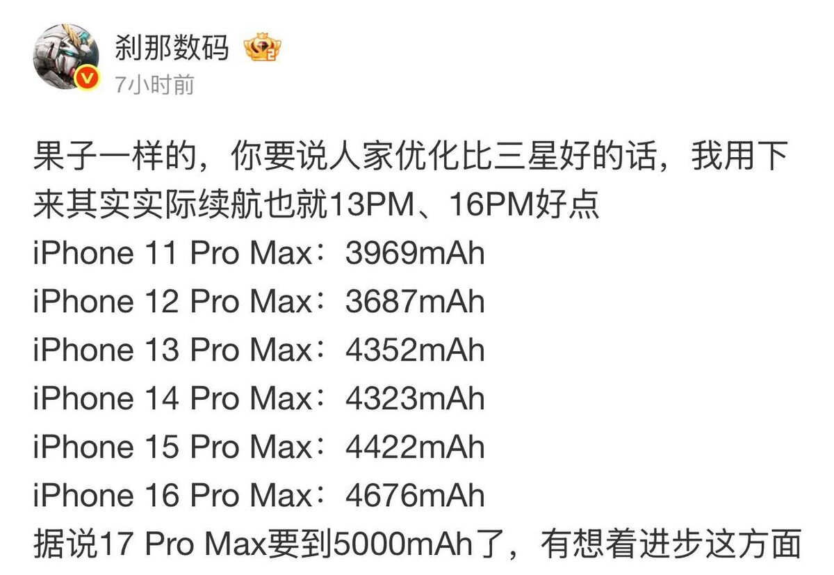 iPhone 17 Pro Max получит самый большой аккумулятор 5000 мАч. По данным Apple, время автономной работы iPhone 16 Pro Max составляет 33 часа. С увеличением ёмкости на 300 мАч Apple может заявить около 35 часов автономной работы. iPhone 16 Pro Max: 4 676 мАч iPhone 17 Pro Max: 5000 мАч В жизни это так же будет существенный прирост к времени работы.