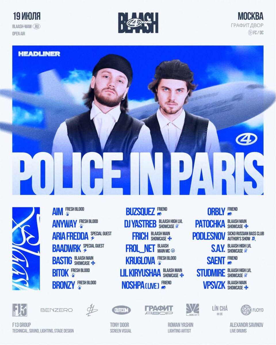 Blaash Open Air! 😃😃 Москва! 19 июля! 🤟 В этот день отметить свой День Рождения приглашает творческое объединение BLAASH, которому исполняется 4 года! 🤚 Как всегда, мясной лайн-ап и мощная шоу-программа! В этот раз команда везет белорусский хард техно дуэт "Police in Paris", который выступит впервые в России! 🙊 Так же на ивенте Вас ждет: 🌟 масштабное музыкально-световое шоу от команды F13 GROUP, пиро/крио эффекты; 🌟 авторский stage и light дизайн от художника Романа Яшина и визуал от Tony Door; 🌟 инсталляции, фотозоны и виджеинг от проекта L8CH; 🌟 съемка и видео-трансляция от коллектива OUTCOM; 🌟 эксклюзивный показ документального фильма "BLAASH: внутри рейва" режиссера Елизаветы Башлаковой; 🌟 S.R.B.C. SHOW от PODLESNOV и многое другое. 🔞 Увидеть все это вживую Вы сможете на площадке Графит. Двор уже 19 июля. Ждем тебя и твоих друзей! До встречи! 🎫 Билеты 📆 18 июля, с 19:00🧟♂️🧟🧟♂️ 📍 Графит, Москва, Электродная ул., 2 ст32