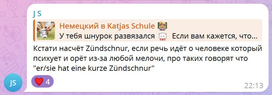 Заводится с пол-оборота 😡 Красиво сказать, что у кого-то нервы явно не в порядке и он как собака бешеная на всех бросается? Мы не планировали искать, но в комментариях #выподсказали! ▫ eine kurze Zündschnur haben – впадать в ярость по любой мелочи, заводиться с пол-оборота Ich habe bei Sarkasmus eine kurze Zündschnur. – Я моментально выхожу из себя, если кто-то ведёт себя саркастично. Warum schreist du wieder rum? So eine kurze Zündschnur ist nicht normal! – Чего ты опять разорался? Так резко реагировать – не нормально! 🐔 А если вам под вечер не хватает кринжа, вот реклама Aldi Süd про актёра с kurze Zündschur. Не особо понимаем, как они это придумали и что этим хотели сказать, ноооо зато вот тот самый "агрессивный немецкий" из клише про Германию 😁 🔡 Учиться с нами