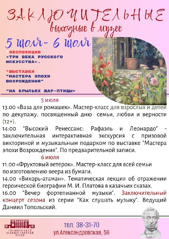 В последние перед длительным ремонтом дни ТХМ подготовил для посетителей насыщенную программу. Гостей музея ждут экскурсии по экспозиции «Три века русского искусства» — ежедневно в 15.00, летние мастер-классы, интерактивная экскурсия по выставке «Мастера эпохи Возрождения» с музыкальным подарком, лекция о Матвее Платове. Завершит программу концерт Даниила Топольского «Классика и неоклассика» — меломаны услышат шедевры классической и современной, неоклассической музыки. «Даниил совсем недавно выступил с невероятным успехом в Москве с этой программой. Теперь она звучит и в Таганроге, — рассказали в ТХМ. — Уже в воскресенье, 6 июля, в 16.00, на музыкальном вечере мы проследим путь развития возвышенной музыки И.С. Баха к академическому минимализму и музыке из 4 аккордов. Узнаем, почему классическая музыка пришла именно к минималистичным формам и почему так актуальна сегодня». Концерт состоится в рамках просветительского проекта Даниила Топольского «Как слушать классику». В программе — музы