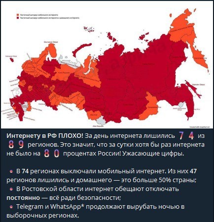В России за последние сутки перебои с интернетом затронули 74 из 89 регионов. Это значит, что временно без доступа к сети остались жители примерно 80% страны. Власти объясняют отключения необходимостью повысить безопасность, особенно в приграничных областях.