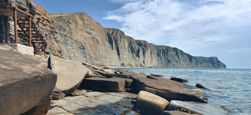 Один из самых необычных пляжей на всей планете. Гигантские плитки «шоколада», ведущие к дикой бухте. Уникальная природная локация, где «оживают» ваши мечты. Береговая линия, над которой находится мыс Бугаз. Огромные каменистые породы в виде плит, напоминающих шоколадные, стали местной достопримечательностью. И да, находятся они в Крыму, точнее, в его юго-восточной части. Визуально территория делится на две части. Первая – это высокие скалы, состоящие из слоистых пород, уводящие в небо. Они имеют грубые и острые края. Вторая – это сам пляж с более обточенными глыбами, которые сформировались под влиянием сильных приливов и отливов. Несмотря на свою красоту, пляж почти никогда не используется в качестве места отдыха. Скорее, он служит яркой фотолокацией. При этом купаться здесь разрешено. В разных частях от отвесной скалы отличается температура воды. Всё дело в том, что с одной стороны берег защищён небольшим пирсом, а с другой он постоянно омывается сильными волнами. Что удивительно, но