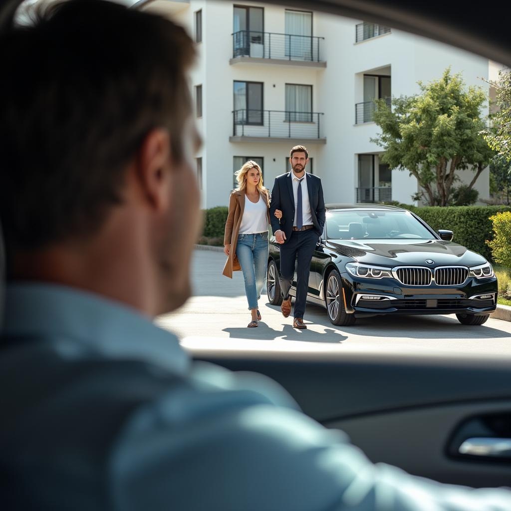 Они идут к черной БМВ. Он открывает ей дверь, она садится.