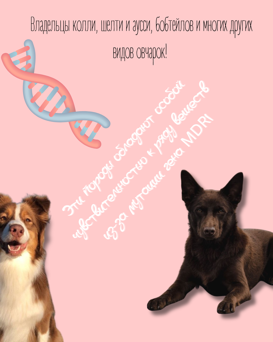 Эти породы обладают особой чувствительностью к ряду веществ из-за мутации гена MDR1 ! Из-за этого многие привычные препараты от эктопаразитов, в том числе капли и таблетки с пиретроидами, могут вызвать у ваших питомцев сильные побочные эффекты. Чтобы защитить вашего любимца, обязательно сделайте тест на мутацию MDR1 — это просто и важно! Анализ крови — самый надежный способ, ведь при взятии мазка изо рта нужно тщательно следить, чтобы собака не пила из чужой миски, не грызла палки, с которыми играли другие собаки, не пила из лужи и не ела траву на улице. Только так можно получить точный результат без ошибок. А вот проверенные и безопасные варианты для защиты от паразитов: Таблетки: Бравекто, Симпарика, Фронтлайн Нексгард (Нексгард Спектра — только под контролем ветеринара!) «НексгарД Спектра ... Щенкам пород собак, чувствительных к макроциклическим лактонам, в том числе колли, бобтейл и шелти, препарат применяют под наблюдением ветеринарного врача.» Капли: Фронтлайн, Фипри