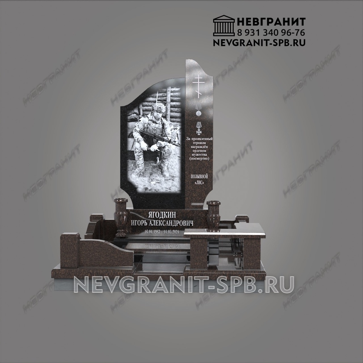 Этот монументальный памятник, изготовленный из коричневого гранита, посвящен памяти Игоря Александровича Ягодкина, отдавшему жизнь за Родину. Дизайн памятника пронизан чувством глубокого уважения и гордости за героизм и мужество воина. Выразительный дизайн: • Фотография воина: Центральным элементом является большая черно-белая фотография Игоря, запечатленного в военной форме. Снимок передает образ сильного и решительного человека, готового к выполнению долга. • Стела с символами: На стеле выгравированы православный крест и медали, символизирующие веру и воинские заслуги. Надпись "За проявленный героизм награжден орденом Мужества (посмертно)" подчеркивает подвиг и самоотверженность. • Позывной "Лис": Добавление позывного воина придает памятнику индивидуальность и позволяет узнать больше о его службе. • Коричневый гранит: Благородный коричневый цвет гранита символизирует силу, надежность и мужество. Он придает памятнику монументальность и величие. • Продуманное основание: Компле