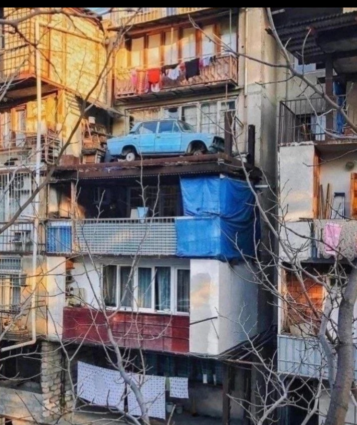 Денег у Резо не было на новые покрышки и он решил машину от греха подальше спрятать... на балконе.