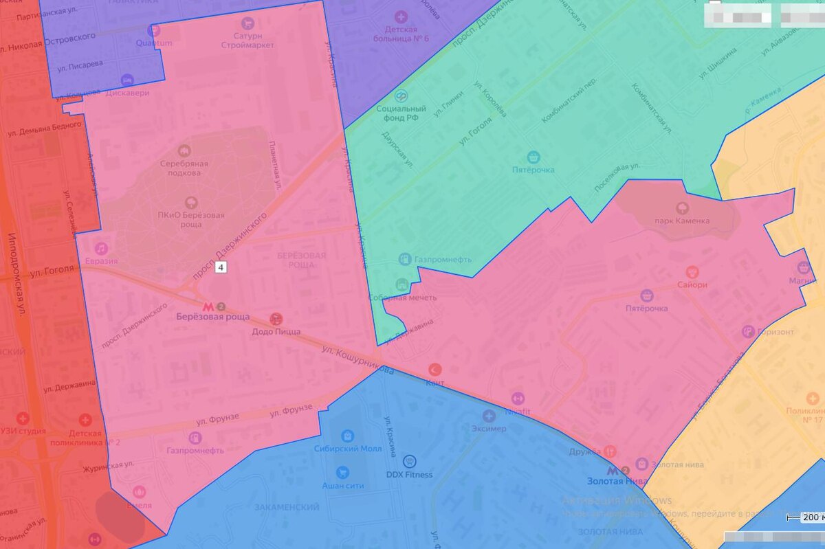 Границы округа – проспект Дзержинского, № 1/1, 2, 2а, 4; улицы: Адриена Лежена, № 6, 6/1, 6/2, 8, 8/1, 8/2, 9, 9/1, 9/2, 9/3, 10, 10/1, 10/2, 10/3, 11, 12, 12/1, 13, 14, 15, 16, 16/1, 17, 18, 18/1, 19, 23, 25, 27, 27/1, 29, 29/1, 31; Алейская, № 10, 12, 14, 43; Бориса Богаткова, № 241, 243, 243/1, 245, 247, 249, 251; Войкова, четная с № 2 по 16, нечетная с № 1 по 15б; Гоголя, № 180, 182, 184, 184/1, 186, 188, 190, 190/1, 192, 194; Державина, четная № 170, 172, 172а, с № 186 до конца, нечетная с № 167 до конца; Ермака, четная с № 162 до конца, нечетная с № 165 до конца; Журинская, четная с № 122 по 140, нечетная с № 123 по 143; Карамзина, 83б; 1-й Кирзавод; Кошурникова, № 2, 2/1, 3, 4, 5, 5/1, 5/2, 5/3, 6, 7, 7/1, 8, 9, 10, 11, 12, 13, 13/1, 13/2, 14, 15, 16, 18, 20, 22, 22/1, 23, 27, 29, 29/1, 29/3, 29/5, 31, 37, 37/1, 39, 41; Красина, № 45, 47, 47/1, 47/2, 51, 61, 61/1; Левый Берег Каменки; Ломоносова, четная с № 220 до конца, нечетная с № 239 до конца; Планетная, № 30, 55/1, 55/2, 55/4, 55/5, 55/6, 55/7; Поселковая, четная с № 2 по 46; Селезнева, № 6, 6а, 8, 24, 26, 26/1, 28, 32, 36, 38, 40; Фрунзе, № 59, 59/1, 59/2, 61, 63, 65, 67, 69, 71, 71/1, 226, 228, 230, 232, 234, 252/1; переулок Карьерный Лог; тупики: Войкова; Державина; проезд Красина; спуск Журинский.