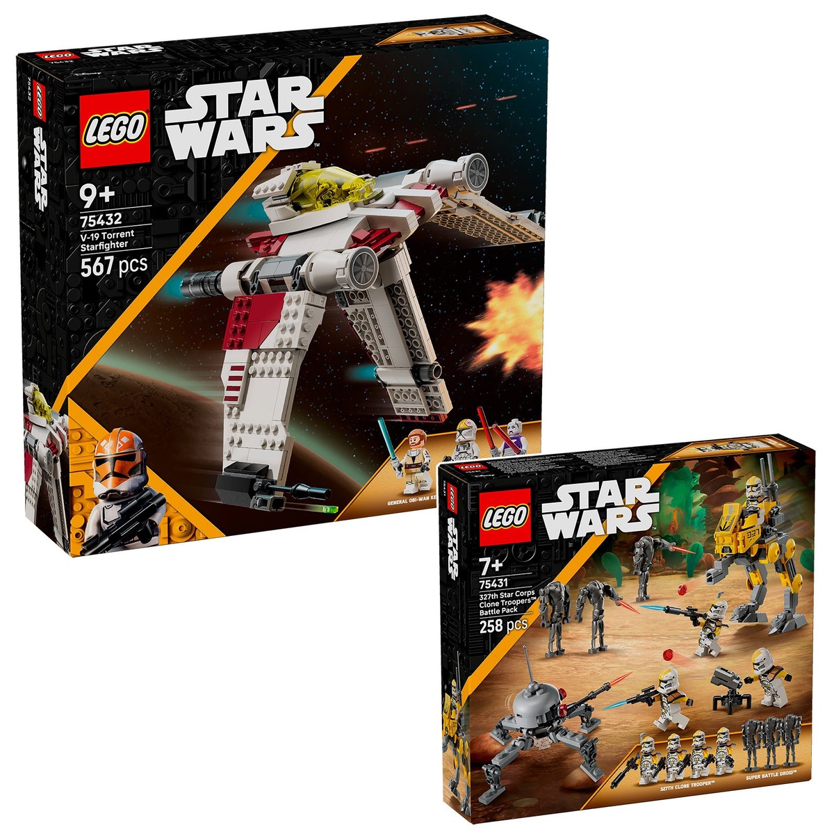 Новые наборы LEGO Star Wars: клоны и звездолёты августа 2025 LEGO анонсировали два новых набора по вселенной «Звёздных войн»: 🔹 327th Star Corps Clone Troopers Battle Pack — 258 деталей, 4 клона элитного корпуса и 3 супер-боевых дроида. 🔹 V-19 Torrent Starfighter — 567 деталей, с Оби-Ваном, Асажж Вентресс и клоном-пилотом. Выглядит мощно! Оба сета выйдут 1 августа. Источник: Hoth Bricks