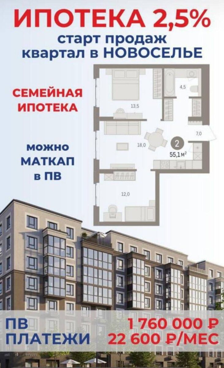Всем привет👋 Делюсь отличной новостью🔥 Новый в Санкт-Петербурге застройщик предлагает самые лучшие ставки по ипотеке в этом году. Если коротко: - ставка 2,5% на весь срок (семейная ипотека) - подходит под любую квартиру - можно использовать материнский капитал в качестве Первоначального взноса В картинках примеры планировок и расчёт ежемесячных платежей Сколько будет действовать предложение - не известно. Успевайте зафиксировать ставку, лучше пока что нет. По всем вопросам: +79667578789 Михаил