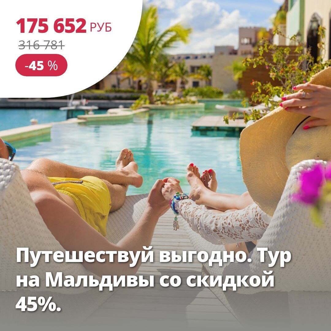 🔥 Цена тура: 175 652 руб/чел ❤️ Путешествуй выгодно. Тур на Мальдивы со скидкой 45%. 🏠 4*, Мальдивы, Мальдивы из Москвы 19 июля на 13 ночей. Мальдивы — это более тысячи коралловых островов в окружении ласковых вод Индийского океана. Здесь райские пляжи с белоснежным песком, богатая тропическая природа и высокий уровень сервиса. Это экзотическое направление выбирают любители роскошного размещения, бесконечного покоя, красивых фотографий. Подробнее здесь: https://starttime.ru/search-tours?tvcard=jg79w7 Лучшие туры https://starttime.ru/search-tours #СтартТайм #ЛучшийТур