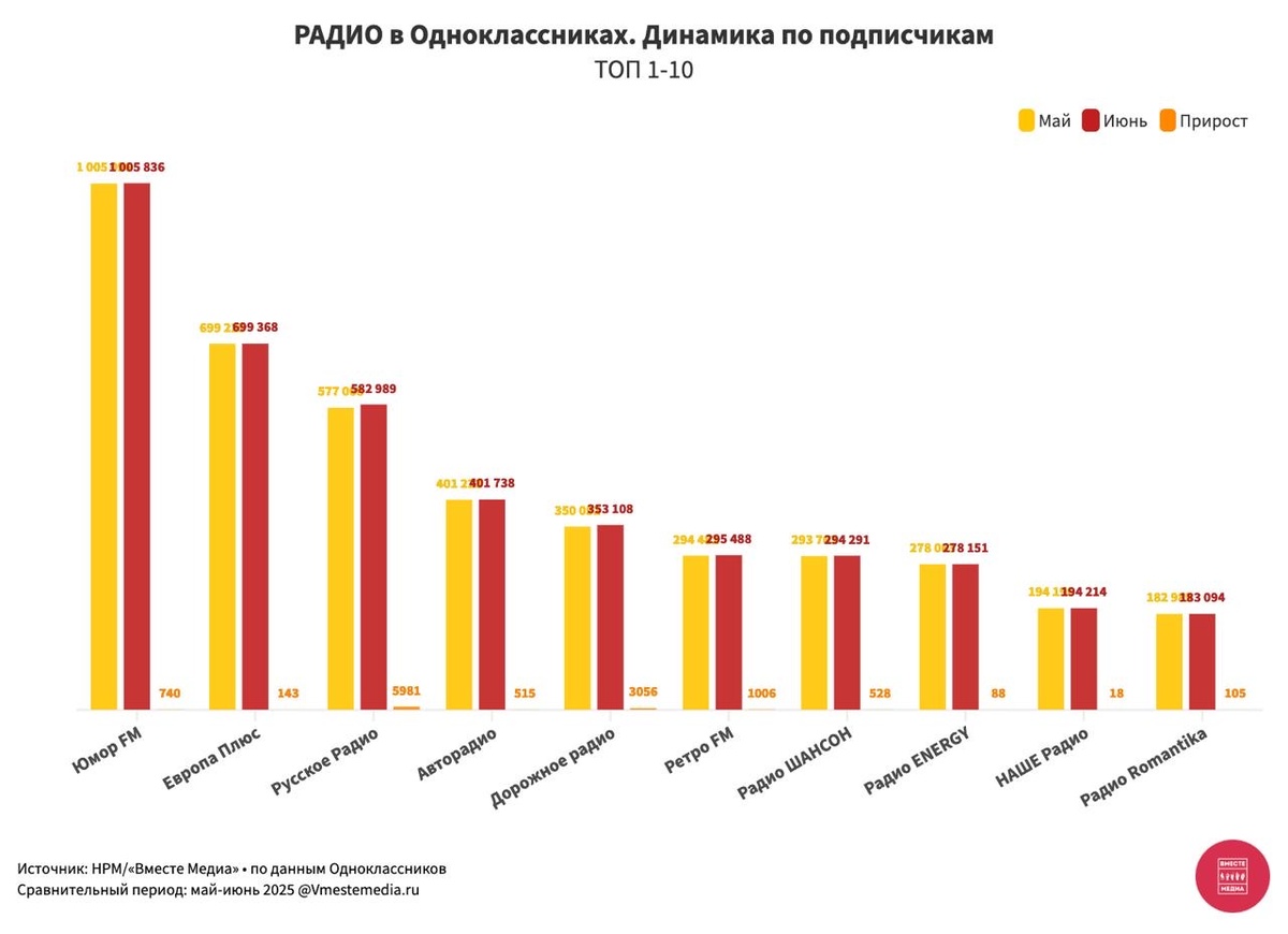 РАДИО в Одноклассниках. ТОП-20 Динамика радиостанций по подписчикам (Май-июнь 2025) ➡️ Юмор FM - абсолютный лидер. Радиостанция преодолела в марте рубеж в 1 млн подписчиков. За весенние месяцы станция продолжала наращивать группу и к концу июня достигла 1 005 836 подписчиков. ➡️ В категории >500К две радиостанции - Европа Плюс (699,3К) и Русское Радио (582,9К) ➡️ В категории >300К также две радиостанции - Авторадио (401,7К) и Дорожное радио (353,1К) ➡️ Наибольший прирост подписчиков наблюдается в мае у Русского Радио 📈+5 981 ➡️ Топ-5 по приросту подписчиков за июнь: 1. Русское Радио 📈+5 981 2. Дорожное радио 📈+3 056 3. Ретро FM 📈+1006 4. Юмор FM 📈+740 5. Хит FM 📈+536 ➡️ Топ-5 по количеству подписчиков: 1. Юмор ФМ — 1 005 836 📈+740 2. Европа Плюс — 699 368 📈+143 3. Русское Радио — 582 989 📈+5 981 4. Авторадио — 401 738 📈+515 5. Дорожное радио — 353 108📈+3 056 Смотреть подробности прироста на графиках: ТОП 1-10 ТОП 11-20 Данные собраны и подготовлены исследовательской группо