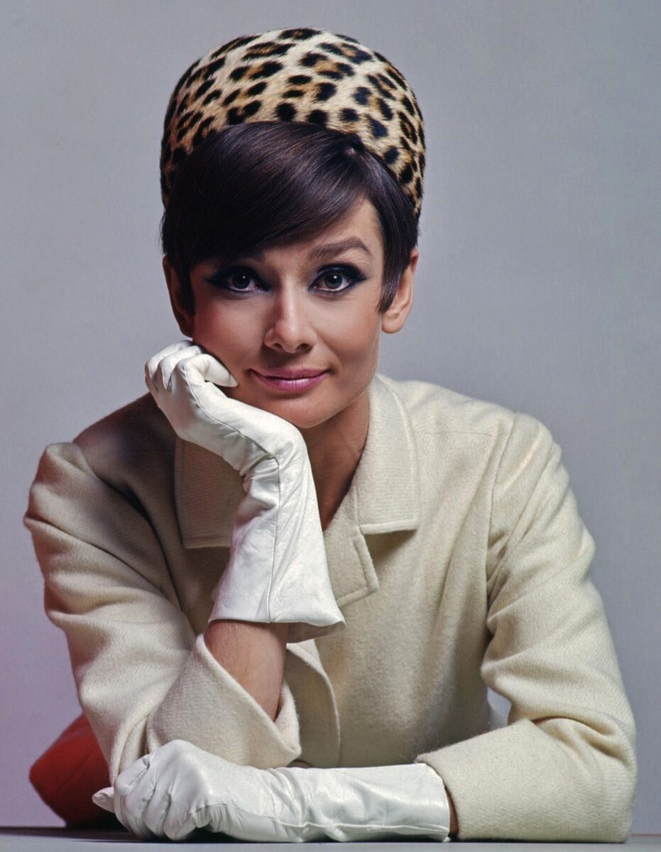 Одри на промо-фотографии к фильму "Шарада", 1963 год. На Одри надета леопардовая шляпка-таблетка от Givenchy.