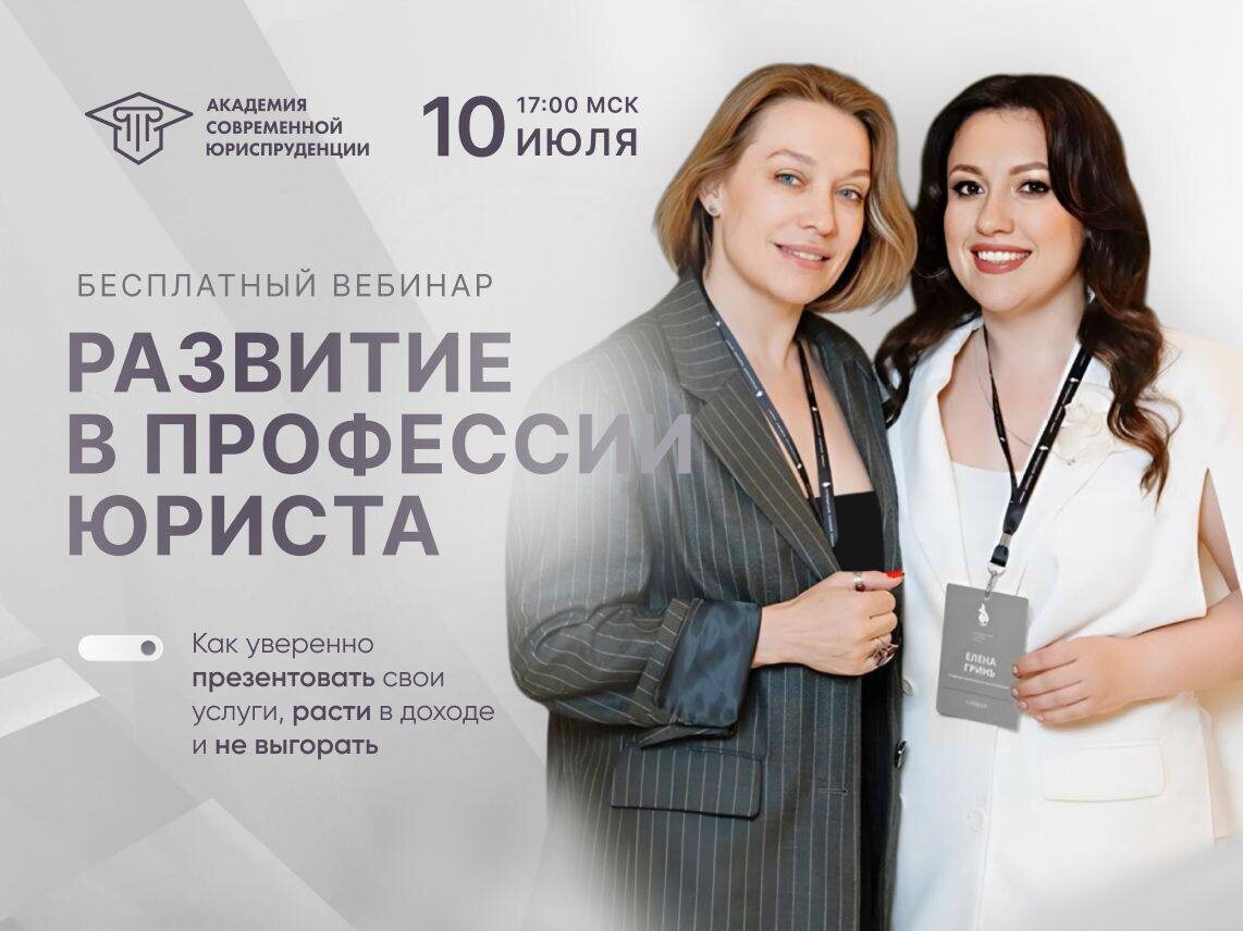 Дорогие мои! Как и просили😌по итогам обратной связи-составили программу вебинара для Вас! 🔥Раскройте свой потенциал в юридической профессии и ценообразовании! Приглашаю вас на бесплатный вебинар «Развитие в профессии юриста: как уверенно презентовать свои услуги, расти в доходе и не выгорать», где мы разберём стратегии профессионального роста, новые возможности в юриспруденции и практические инструменты для вашего развития. 📅 Дата: 10 июля 2025 года ⏰ Время: 17:00 по МСК Спикеры: ⭐️Елена Гринь – к.ю.н., доцент, заместитель заведующего кафедрой интеллектуальных прав Университета им. О.Е. Кутафина (МГЮА), член Научно-консультативного совета при Суде по интеллектуальным правам, практикующий юрист, эксперт и спикер юридический форумов, автор более 120 работ по защите интеллектуальных прав. ⭐️Елена Ершова – основатель #культураконсалтинга , экс. глав.ред. «Корпоративный юрист», автор книг «Бизнес и юрист. Найти друг друга», «Личный бренд VS репутация. Как успешно продавать, оставаяс