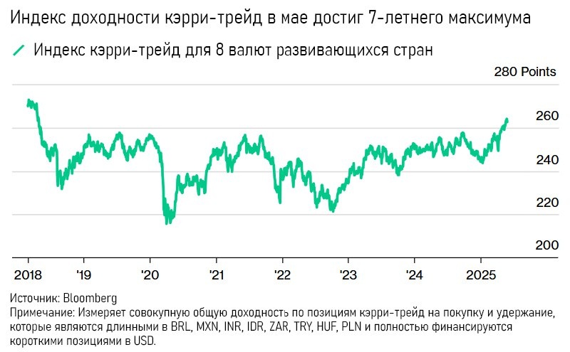 Кэрри-трейд набирает обороты Пока свежа вчерашняя новость, добавим ещё про кэрри-трейд. Напомним, кэрри-трейд — стратегия, при которой инвесторы занимают средства в валютах с низкими процентными ставками (например, в японской иене, евро, швейцарском франке) и вкладывают их в высокодоходные активы в развивающихся странах (например, в мексиканское песо, бразильский реал, турецкую лиру). В конце мая индекс доходности таких операций достиг семилетнего максимума. Это оживление обусловлено сочетанием нескольких факторов: 1. Снижение волатильности на рынках Кэрри-трейд наиболее выгоден, когда на рынках спокойно (в периоды низкой волатильности). В апреле-мае глобальная валютная волатильность (колебания), измеряемая индексом JPMorgan, упала с 11% до 8,7%. Это произошло по двум причинам: • Торговые риски снизились — Трамп не ввел часть запланированных пошлин, что уменьшило опасения по поводу валютных кризисов в развивающихся странах. • Рынки адаптировались к повышению ставки Банком Японии