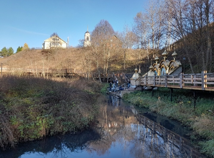 04.07. 2025 В нашей любимой турфирме есть несколько экскурсий с посещением Троице-Сергиевой лавры. Мы побывали на двух таких экскурсиях ( и имеем в планах третью, но ещё нескоро))). Все экскурсии отличаются друг от друга, общее у них - посещение лавры. Первая экскурсия состоялась 22-го октября 2024 г. Называлась она, как можно догадаться, "Гремячий Ключ живой воды" , и начиналась с посещения Радонежа, где провёл свои детские годы будущий святой. По преданию, на холме, у подножия которого сейчас берёт начало святой источник, стоял дом родителей Варфоломея (будущего Святого Сергия Радонежского) - Кирилла и Марии. В Радонеже рядом с Преображенским храмом установлен первый в России памятник святому работы скульптора В.Клыкова (1988): Далее мы отправились к ещё одному источнику, находящемуся уже в самом Сергиевом Посаде недалеко от стен лавры. Источник - в заброшенном состоянии, но, как нам рассказали, должен быть облагорожен в ближайшем будущем. Рядом с источником установлена ча
