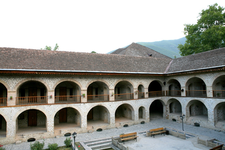 Здание шекинского караван-сарая, между тем, чрезвычайно интересное. Построено оно из широко распространённых в тех краях материалов - речного камня и жжёного кирпича. Из кирпича выстроены только ритмично расположенные арки, а сами стены как бы заполнены речным камнем - материалом, который природа подарила людям, жившим в этих краях. Черепичная крыша, прямоугольный двор, номера для постояльцев на втором этаже и лавки купцов, распахнутые дверями наружу здания на первом этаже, склады для товаров в полуподвальных помещениях - всё более, чем рационально.