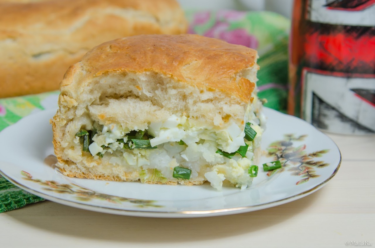 Родители передали с дачи зеленый лук. Часть я заморозила, а часть оставила на пирог. Рис уже был готов. И пока поднималось тесто, я отварила яйца и порезала лук. Рецепт теста у меня для хлебопечки, но я давно им пользуюсь и адаптировала для замеса руками. Не удержалась и к этой картинке лука добавила цветы календулы, которую мы сушим на зиму. Дрожжевое тесто Начинка Резать пирог горячим, конечно, плохая идея, но голодные дети не захотели ждать... Приятного аппетита!