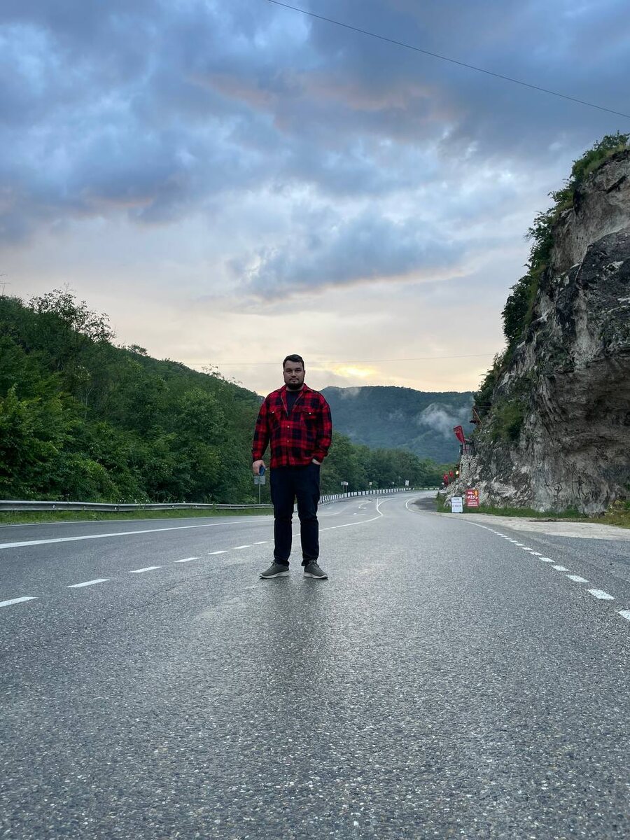 Республика Адыгея. Станица Даховская. Первый день. На фото: я, так называемый камень «Титаник» на реке Белая, закат.